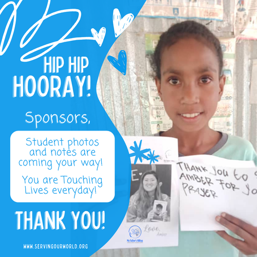 Student photos and notes like these are beginning to arrive from “My Father’s Hilltop” campus just for you! Written by the children filled with love and prayers for you! When your child's photo & letter arrive we'll email them directly to you!
